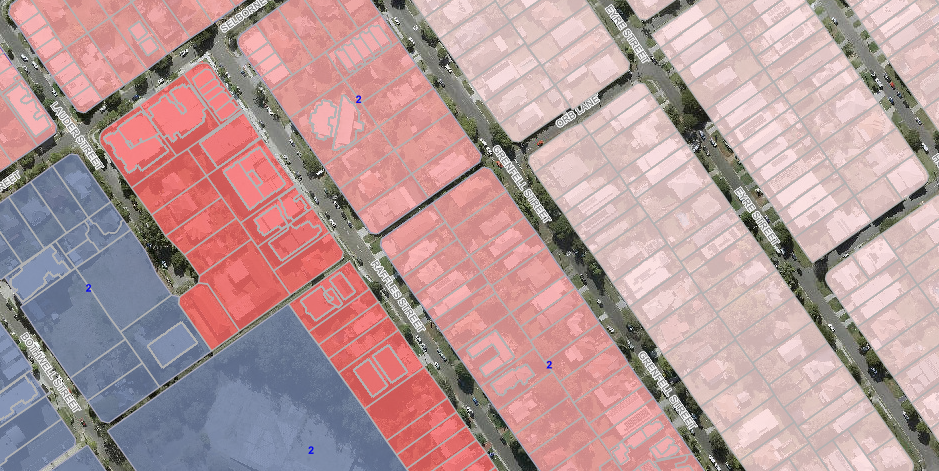 The image above shows an area containing District Centre (blue; think shops), High Density Residential (red; think apartment buildings), LMR2 (pink-red; townhouses) and Low Density Residential (pink; suburbia).